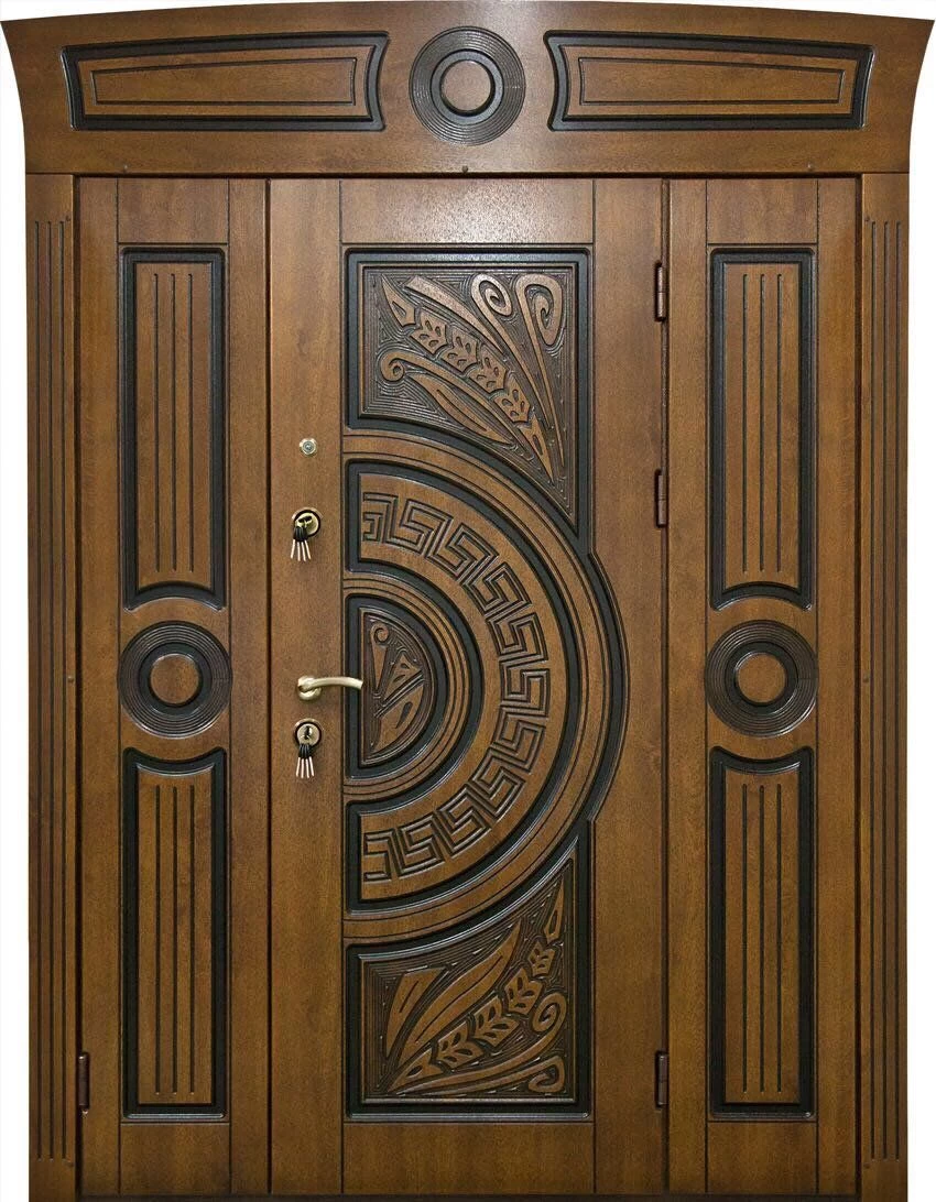 Парадные двери относятся к изделиям премиум-класса. Изготавливаются такие модели из металла толщиной не менее 2,0 мм, конструкция усиливается ребрами жесткости. Основной фактор, делающий парадные двери таковыми – их внешняя отделка. Для декора этих дверей, как правило, используют массив дуба, ясеня или сосны, натуральный шпон, корабельную фанеру, МДФ-панель, покрытую атмосфероустойчивой пленкой Винорит (VINORIT). Декоративные вставки из антивандального стекла, с применением элементов ковки, рисунок, который будет сочетаться с рисунком решеток на окнах, придаст коттеджу неповторимый внешний вид. Можно декорировать дверь витражным узором – и ваш дом заиграет яркими красками. По конструкции парадные двери могут быть как одностворчатыми, так и двустворчатым. При достаточной высоте проема, можно изготовить входную группу с декоративной вставкой сверху – прямоугольную или в виде арки. Терморазрыв в конструкции парадной двери сохранит тепло в доме, и предотвратит промерзание и кондедсирование двери в холодное время года, при этом не требуется обустройство в доме холодного тамбура.